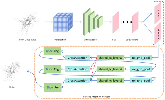 In this study, Voxel–RCNN is adopted as the baseline, with targeted enhancements introduced to address its existing limitations [9]. The proposed improvements primarily focus on three components: the 3D backbone network, the 2D backbone network, and the cascaded attention network applied after the RPN in the first stage. The overall framework of the proposed approach is illustrated in Figure 1.
