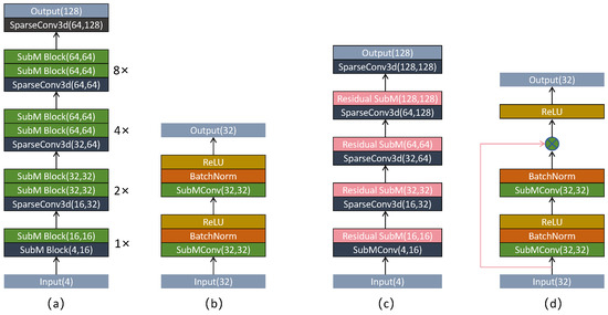 In Voxel–RCNN, the 3D backbone network is employed following voxel encoding [13], with the objective of extracting spatial features from non-empty voxels. This network primarily comprises Submanifold Convolution Blocks and Sparse Convolutions, which substantially reduce computational complexity while retaining rich feature representations for use in the subsequent RPN. As illustrated in Figure 2a, the 3D backbone network of Voxel–RCNN receives a four-dimensional voxel input containing the X, Y, and Z coordinates, as well as reflectance intensity. Initially, a Submanifold Convolution Block is applied to perform 1× downsampling [27], increasing the number of channels from 4 to 16. This is followed by an additional Submanifold Convolution Block for further feature extraction. Subsequently, sparse convolutions are employed to perform 2×, 4×, and 8× downsampling operations using a 3 × 3 × 3 kernel, with the number of channels gradually increased from 16 to 64 [28]. After each sparse convolution, two Submanifold Convolution Blocks are applied to extract features at multiple scales. The structure of a Submanifold Convolution Block is depicted in Figure 2b and consists of a submanifold convolution layer, normalisation layers, and activation functions. The original 3D backbone network adopts a linear structure, which means that feature extraction is carried out in a sequential manner. This approach results in insufficient multi-scale feature fusion, making it difficult for high-level abstract features to retain low-level detail information. Consequently, when features are subsequently compressed into the BEV representation, more low-level details are lost. To address this issue, residual connections have been integrated into the existing 3D backbone network. These connections facilitate the fusion and interaction of features across different levels, thereby enhancing the effectiveness of feature extraction in subsequent stages [29]. Specifically, the proposed method modifies the final two Submanifold Convolution Blocks, which are responsible for increasing the number of feature channels, by replacing them with residual Submanifold Convolution Blocks, as illustrated in Figure 2d. This design ensures that the features of small-scale objects are better preserved during the channel expansion process. Let x denote the original input, the output of the intermediate network layer, and y the output of the residual connection. The corresponding computation is defined as follows: