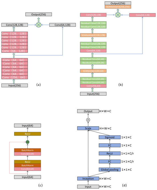 (a) Original 2D backbone network, (b) modified 2D backbone network, (c) residual convolutional block, (d) SE attention mechanism.