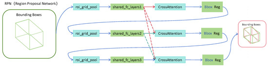 Inspired by the remarkable performance of the 2D Cascade Attention Network in object detection tasks, this study extends its underlying principles to the domain of 3D object detection, and proposes a 3D Cascade Attention Network to improve detection accuracy and feature representation capability [33]. The overall process is illustrated in Figure 4. Initially, pooling operations are applied to the candidate regions generated by the RPN in order to extract features from within these regions. The primary aim of this step is to standardise Region of Interest (RoI) features of varying scales into a fixed size, thereby ensuring consistent input for subsequent processing via a Multi-Layer Perceptron (MLP). During the cascading phase, the features are iteratively refined and updated at each stage. To maintain the flow of global information and avoid redundant feature learning at individual stages, a Shared Feature Connection layer is introduced. Furthermore, to strengthen the network’s representational capacity, Cross Attention is incorporated into the cascade framework [34]. denotes the encoded features from the previous stage, whereas represents the encoded features at the current stage. Here, , and , corresponding to the query, key, and value, respectively. The computation is formulated as follows: