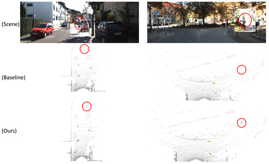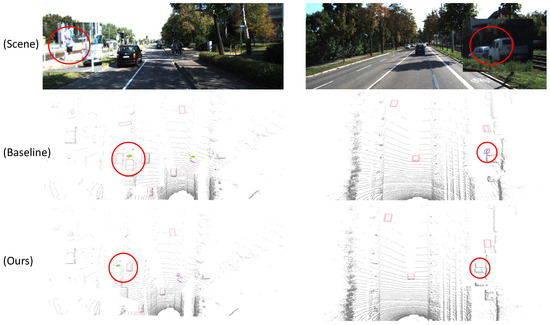 To thoroughly validate the effectiveness of the proposed approach, a series of systematic ablation studies were conducted to evaluate the individual contributions of each module to the overall model performance. Starting from the baseline model, the CAN, RAN, and 3D Residual module were introduced in succession. The experimental results demonstrate that the incorporation of these modules led to significant improvements in detection performance. Specifically, the 3D bounding box detection accuracy for cars, pedestrians, and bicycles under the three difficulty levels was improved by 0.47%, 3.09%, 3.34%, 10.71%, 11.81%, 10.75%, 5.61%, 4.67%, and 4.61%, respectively. The performance metrics for Voxel–RCNN were obtained using publicly available open-source code. Detailed results are provided in Table 2.