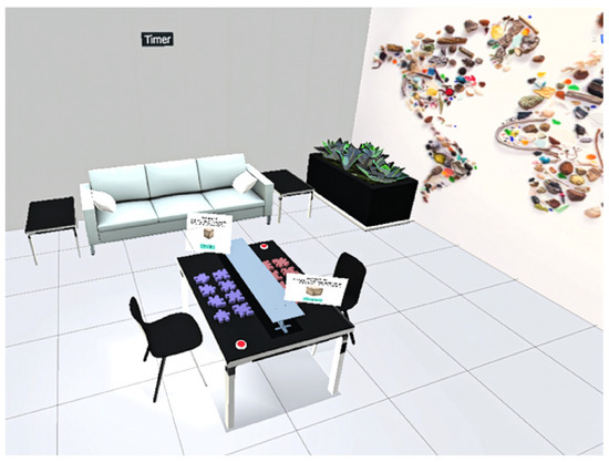 In this study, these design principles are applied to multi-user VR scenarios with the specific goal of investigating soft skills in action. Instead of focusing solely on participant choices, the environment itself shapes how collaboration emerges. Carefully embedded constraints and affordances create conditions that draw out behaviors such as negotiation, turn-taking, joint attention, and clarifying speech—without the need for scripted prompts. This approach offers a structured yet naturalistic context in which communication and collaboration can be observed, analyzed, and ultimately better understood. Both collaborative tasks were deployed in the same virtual environment, designed to maintain consistency while allowing specific design manipulations. In all scenarios, participants were placed in a virtual face-to-face interaction across a table (although they were physically separated in different rooms), each represented by a half-bodied avatar capable of head, eye, and hand movements. This spatial orientation—participants positioned opposite one another—was a deliberate design choice, as relative body placement in VR can significantly influence interaction dynamics. In reality, each participant is placed in a separate room. To support task understanding and reduce reliance on external instructions, each participant had access to an interactive virtual screen. These screens provided contextual information, including task objectives, rules, and example visuals. In addition, a red virtual button assigned per participant allowed them to signal task completion. Each task was capped at a maximum duration of 16 min, adding time pressure as an implicit coordination challenge. These interface elements remained consistent across both scenarios to ensure baseline comparability, while the interaction mechanics and information structures varied by task.