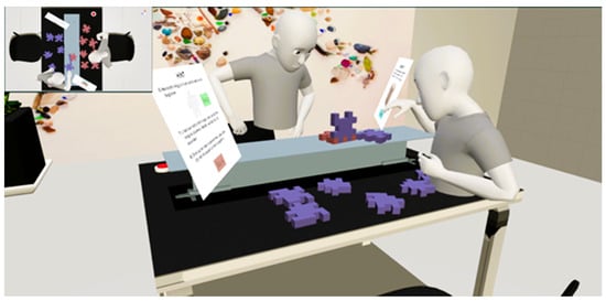 The study followed a within-subjects design, with all dyads completing two collaborative VR tasks in a fixed order. Task 1 (Dynamic, Known Goal) was always presented before Task 2 (Structured, Unknown Goal). This sequence was chosen to guide participants from a more exploratory, spatially intuitive task toward one with structured, verbal coordination. Counterbalancing was avoided to prevent the structured communication patterns of Task 2 from bleeding into Task 1, where spontaneous collaboration was a key focus. A fixed order also ensured consistent comparisons of interaction behavior across conditions. Each task was time-limited to 16 min. Participants were instructed to complete the task as efficiently and collaboratively as possible. The total session—including both tasks and a short VR acclimatization period—was capped at 35 min. The fixed durations were designed to encourage timely interaction and decision-making without inducing artificial pressure. Throughout the experiment, an external observer view was available to the research team. This observer interface displayed the virtual scene from a top-down perspective of the shared table and included two additional camera feeds, each positioned at an oblique angle resembling an over-the-shoulder view of one participant facing the other. These camera views provided comprehensive visual coverage of both participants’ actions and interactions, allowing for real-time monitoring and supplementary qualitative analysis of collaborative behaviors. The cameras were initially configured using orthographic projection to ensure a consistent, undistorted field of view across sessions. Examples of these observer views can be seen in Figure 4 and Figure 5.