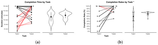 Completion metrics by task. (a) Completion time; red lines indicate dyads that took longer to complete Task 2 compared to Task 1. (b) Completion rate; red lines indicate dyads with a lower completion rate in Task 2 compared to Task 1. Violin plots show distributions. * indicates .