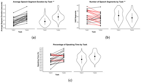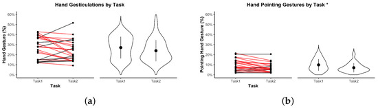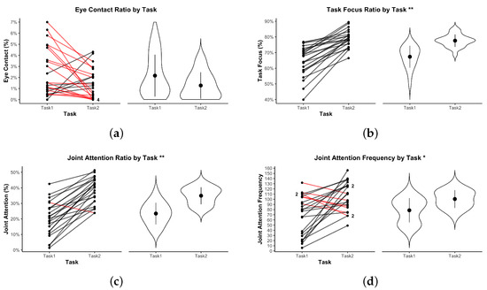 Figure 6a shows the completion time of each dyad. Seven dyads reached the 16-min time cap in Task 1, compared to only five in Task 2. No significant difference in overall task duration was observed between Task 1 ( min, min; ≈ 12 min 13 s) and Task 2 ( min, min; ≈ 13 min 39 s), , , Bonferroni-corrected , .