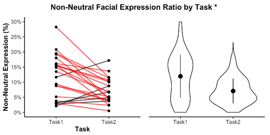 Expression changes were detected by examining sliding windows of 3 s, during which we calculated the absolute differences in AU values compared to the preceding window. A significant non-neutral expression was registered when at least two AUs increased above the chosen threshold within the same time frame. This approach avoids reliance on predefined categorical emotion labels and instead captures the presence and magnitude of facial expressiveness across tasks while maintaining the underlying continuous nature of the data.