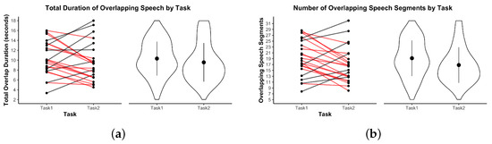 Overlapping speech metrics by task. (a) Total overlap duration. (b) Number of overlaps. Violin plots show distributions. Red lines indicate dyads where the metric decreased from Task 1 to Task 2.