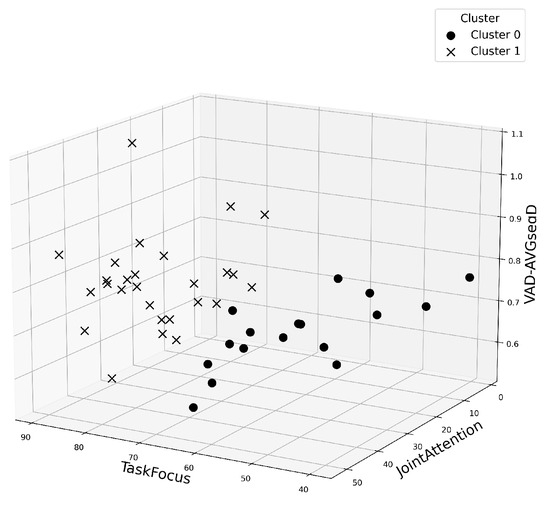 To evaluate whether or not participants’ behavioral profiles could distinguish the two collaborative tasks in an unsupervised setting, we performed a clustering analysis using the most informative features from the earlier Random Forest importance ranking. From this ranking, the three highest-ranked features—joint attention, task focus, and average speech segment duration—were selected as input variables for clustering. Silhouette scores were computed for solutions ranging from to . The highest silhouette score was observed at , with a value of 0.3969, indicating a moderate clustering structure. Using , KMeans clustering was performed on the selected features. The resulting clusters are visualized in Figure 12, depicting how dyads distributed across the feature space.