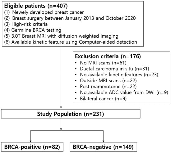 This study received approval from our institutional review board (IRB). The requirement for written, informed patient consent was waived by the IRB (IRB number 2023AN0368). Our institution’s medical records from January 2013 to October 2019 were retrospectively reviewed. From this review, 407 consecutive breast cancer patients tested for germline BRCA mutation due to high-risk criteria (breast cancer patients ≤ 65 years, patients with a family history of breast or ovarian cancer, early-onset triple-negative breast cancer, and bilateral breast cancer) were collected. Our inclusion criteria were as follows: newly diagnosed invasive breast cancer through core needle biopsy, underwent a preoperative MRI with available kinetic features and ADC values using a CAD, and received breast cancer surgery in our institution. Among them, 176 patients were excluded from the study due to the following reasons: no MRI scans (n = 61), ductal carcinoma in situ (n = 31), outside breast MRI scans (n = 22), no available kinetic features or ADC values with our CAD system (n = 32), mammotome excision or biopsy before MRI scans (n = 22), and diagnosis of bilateral cancer (n = 9) because it was not possible to determine which side’s cancer was associated with the BRCA mutation. Finally, 231 women (mean age ± standard deviation, 50.3 years ± 12.6; age range, 26–87 years) were enrolled (Figure 1). Among them, 82 patients were identified as having a BRCA mutation (BRCA-positive) while the remaining 149 were wild type (BRCA-negative).