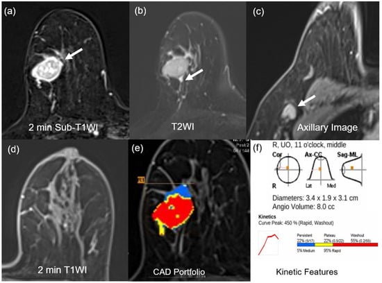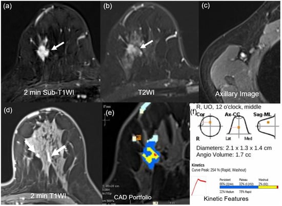 - Baltzer, P.A.T.; Yang, F.; Dietzel, M.; Herzog, A.; Simon, A.; Vag, T.; Gajda, M.; Camara, O.; Kaiser, W.A. Sensitivity and specificity of unilateral edema on T2w-TSE sequences in MR-Mammography considering 974 histologically verified lesions. Breast J. 2010, 16, 233–239. [Google Scholar] [CrossRef] [PubMed]