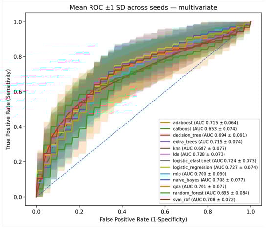 We performed predictive analysis to investigate the effectiveness of significant features selected from Table 1, Table 2 and Table 3 (multivariate). In this study, we compared a total of thirteen ML models, including Adaboost (AB), CatBoost (CB), Decision Tree (DT), Logistic Regression (LR), Random Forest (RF), Support Vector Machine (SVM), k-NN, Naive Bayes (NB), multilayer perceptron (MLP), linear discriminant analysis (LDA), quadratic discriminant analysis (QDA), Extra Trees (ET), and Elastic Net (EN). All codes and implementations have been made publicly available at https://github.com/YoonSangCho/MultiparametricMRI (accessed on 22 August 2025).