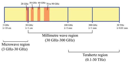 The need for a new wireless communication technology has been raised due to the widespread use of mobile devices and industrial applications [1,2]. The millimeter-wave (mm-wave) and terahertz (THz) frequencies, which are a subset of electromagnetic (EM) waves [3], are identified as the solution for the next generation in high-end applications such as remodeling telecommunications, imaging, and sensing [4,5]. One of the benefits of these high frequencies is enabling localization performance in an accurate and precise way [6] and they can offer high data rates and low latency [7,8]. At various frequency domains, there are diverse applications (Figure 1 represents the various frequency domains). The mm-wave band frequency ranges from 30 GHz to 300 GHz, and the THz band frequency is from 0.1 to 30 THz [9,10]. As is clear from the depicted figure, the THz bandwidth is large enough for transmitting huge data rates and also appropriate for short-range indoor situations [11].