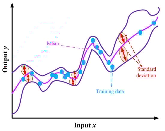 Bayesian optimization (BO) is a common algorithm used in the AI method and can be defined as either a single-objective or a multi-objective method. By constructing the Gaussian process (GP) regression, any given input data defined as x is inserted into the optimization method, and the output parameter defined as is predicted (see Figure 2). The GP presents a Bayesian posterior probability distribution and aims to estimate the new value by paying attention to the current posterior distribution.
