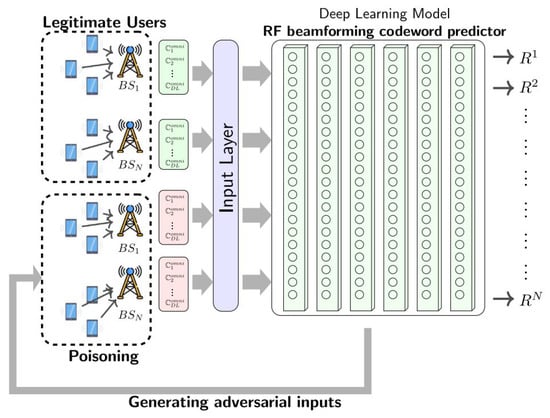 In [54], a methodology for adversarial attacks against the proposed 6G ML is presented that helps in mm-wave beam prediction. Figure 6 presents the diagram for the adversarial training process that is based on DL modeling. Adversarial inputs are generated after the model is constructed, and the model becomes stable when the training is finalized. After this process, the trained model will estimate the radio frequency (RF) beamforming codeword for appropriate users.