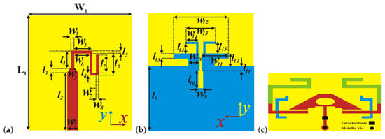 Presented (a) front side and (b) back side of antenna, (c) filter configurations presented in [60].