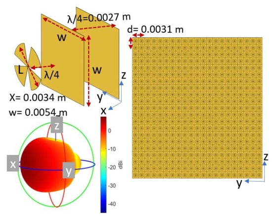For calibrating mm-wave on-chip circuits, a methodology, namely a thru-reflect-line NN, is employed in [59], allowing more accuracy and flexibility in comparison with conventional thru-reflect-line methods. This ML-based method estimates the S-parameters of the device under test. This method is validated for calibrating the transmission lines for the whole D-band of 110–170 GHz. In [60], a 5G mm-wave dipole antenna is designed and fabricated, allowing a high gain of 6.7 dBi at 28 GHz. Additionally, a 5G filter with a gain insertion loss lower than 0.6 dB is presented. For the designed phased-array structure, ML with the collaboration of BO is executed in the hybrid beamforming, leading to achieving suitable gains in analog and hybrid beamforming. The general configuration of the antenna with filter is presented in Figure 7.