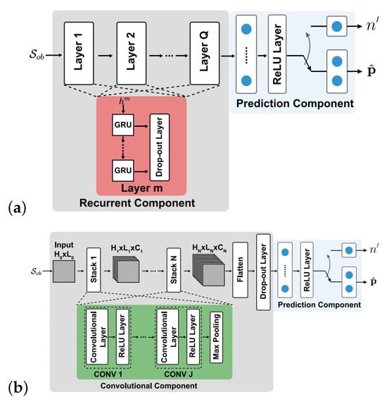 For estimating the future dynamic line of sight link blockages, in [70], DNN is employed, which results in 85% accuracy. In this study, the link blockage status is estimated by the recurrent neural network (RNN), and also the link status with the type and moving direction of the blockage through CNN. The structure of RNN and CNN is depicted in Figure 9, respectively.