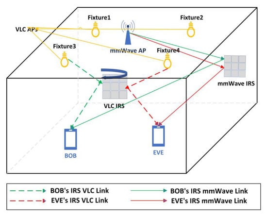 A general view of mm-wave system, modeled by intelligent reflecting surfaces (IRS)-assisted visible light communication (VLC) presented in [80].