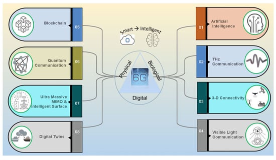 In the telecommunication industry, there are various studies on the development of 6G, especially from the view of the 6G ecosystem [97]. This 6G technology can be executed in various domains, as depicted in Figure 14. The utilization of the THz frequency band for 6G communication has become popular recently due to its high data rate transportation, which is also important for AI science. This new frequency band could be developed for quantum communications as well as predicted in [98]. In [99], the intelligent reflecting surface (IRS) is presented, which operates in the THz frequency band and is able to generate a controllable propagation environment. In this work, the DL-based channel estimation method is introduced by providing a solution for the sparse recovery problem. In another study [100], a framework based on AI is presented, leading to operation at THz bandwidth. This methodology helps in improving base stations and LoS communication. The simulation results demonstrate the 61% improved results in comparison with conventional channel state information. With the help of the DL method, in [101], a methodology for following the IRS reflection coefficients is presented that is useful for THz communication systems. Here, a liquid state machine with an ensemble learning technique for achieving the targeted specification is employed. The THz signal identification is studied in [102], which results in specifying the glass fiber-reinforced polymer, which solves problems in THz nondestructive testing. In this work, various THz signals are classified.