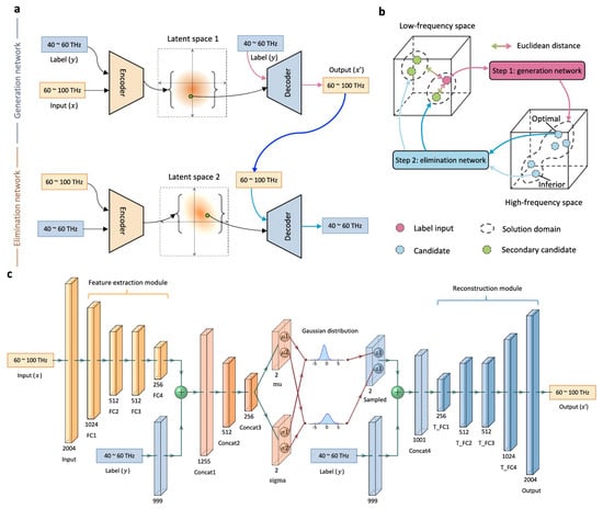 The THz metasurface structures are presented in [103] to link the reflection spectra from low to high frequencies. For this case, a DL method is employed with which inaccessible spectra are predicted with an accuracy of 98.77%. The general configuration of the presented network is depicted in Figure 15. The NN structure involves a generation network and an elimination network, where the first network is used as a generator to manufacture various candidates and the second network is used as an inspector to select the optimum solution.