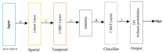 The investigated model consists of four main parts (as shown in Figure 1): spatial encoding, temporal encoding, an attention mechanism, and a classifier. This model combines spatial-temporal attention techniques while ensuring CPU-friendly operation to allow real-time applications. We assume the input is a sign language video, which is fed to MediaPipe to extract features represented by , where , represents the number of landmarks (95), and represents the (x, y, z) coordinates of each landmark. For spatial feature extraction, a linear layer, followed by an ReLU activation function (), is used to find , where and is the feature dimension. Then, the spatial features are fed to the two bidirectional GRU layers to capture the temporal features, and the output of forward and backward GRU is represented by , where G is the hidden dimension. Then, the attention layer is used to calculate the weighted features from as , where is the attention weights. Finally, the classifier head applies the linear projection to produce the output , where , is the number of sign classes, and the final classification output is obtained as .