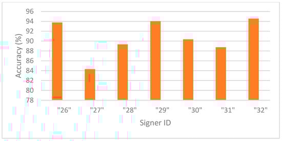 Figure 2 presents the accuracies in signer-dependent mode for each signer in Exp_3. Signer 11 is an outlier with an accuracy of 89%, while the rest of the signers have accuracies of almost 96% and above, indicating that the model is robust, effective, and well trained using signer-specific data. Figure 3 presents the accuracy in signer-independent mode for each signer at the testing stage using the model for Exp_8. All signer accuracies are above 88% except for signer 27, who has the lowest accuracy at 84.3%. These results indicate that the model generalizes well across unseen signers and learns well in a signer-invariant manner.
