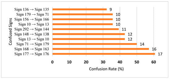 The top 10 most confused signs for the Exp_8 model are presented in Figure 4. From Figure 4, the two highest confusions occur between sign 177 (menstruation) and sign 176 (menstrual_period), and sign 168 (letter_zei) and sign 163 (letter_taa). For the signs 177 and 176, we found that they were actually the same videos but with different labels. For the signs 168 and 163, the two signs have very similar motion performed with two fingers of the right hand.