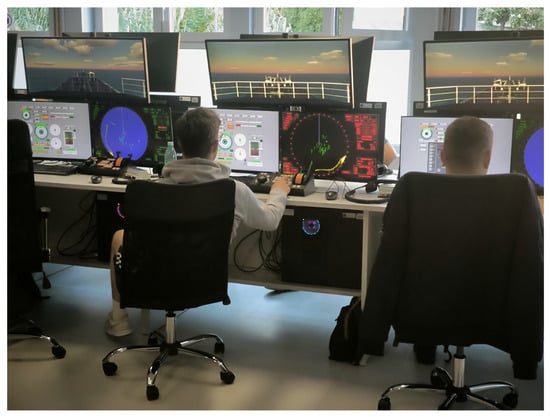 The research was conducted in a nautical simulator (Wärtsilä, Portsmouth, UK) featuring a modern, ergonomic console with standard navigation tools, including multifunctional displays, a conning station, radar, and an overhead monitor for simulating an external view (Figure 1). For the realistic nautical simulation environment, Wärtsilä NTPRO 6000 software was used [18], which supports Automatic Radar Plotting Aids training [19]. The operational challenges were similar to those in real maritime settings, such as collision avoidance, maneuvering through dense traffic, and maintaining situational awareness.
