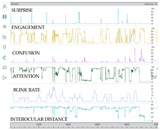 Analysis of facial expressions: the x-axis presents time in minutes, and the y-axis presents norm values. The captured video signal was analyzed at a 30 Hz sampling rate, where subtle facial expressions and micro-movements were detected, reflecting features such as surprise, engagement, confusion, attention, blink rate, and interocular distance.