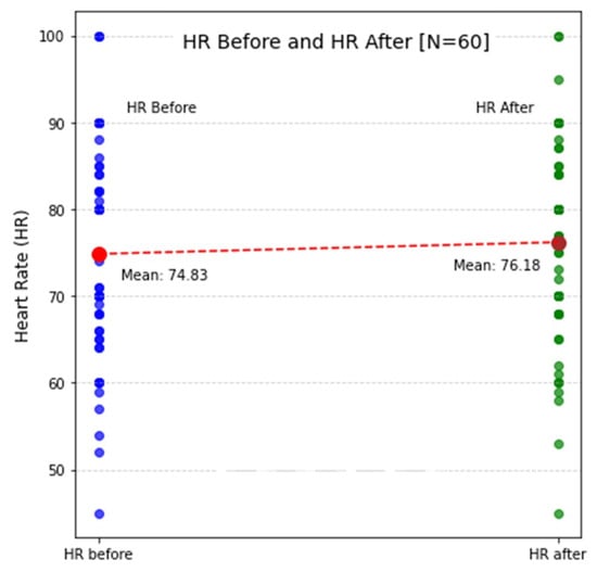 Similarly, Figure 3 visualizes heart rate measurements before and after each simulation session, providing insight into physiological responses over time. The y-axis represents HR values, while the x-axis corresponds to before and after sessions. The height of the blue dots indicates the HR value before the simulation, while green dots represent HR after. A red dot marks the mean HR value across groups, offering a reference point for overall trends. The upward slope of the red trend suggests that HR after the session is generally higher than HR before, indicating an increase in physiological activation or stress response due to the simulation [37].