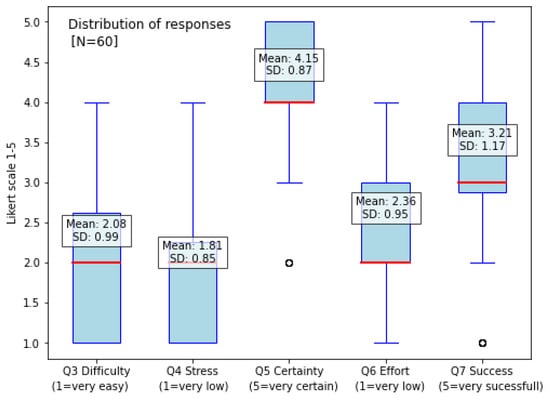 The distribution of responses for questions Q3 to Q7 are presented in Figure 4, which summarizes the variability and central tendency of participants’ self-reported experiences. Each box corresponds to a specific question: Q3 (difficulty), Q4 (stress), Q5 (certainty), Q6 (effort), and Q7 (success). The whiskers extend to show the full range of responses, while the boxes represent the interquartile range (IQR), covering the middle 50% of values. The red median line within each box highlights the central tendency of responses, while any points beyond the whiskers indicate outliers, reflecting individual differences in perception. The lower values for difficulty (Q3), stress (Q4), and effort (Q6) indicate lower perceived challenge, stress, and mental effort, respectively. In contrast, higher values for certainty (Q5) and success (Q7) represent greater confidence and perceived success.