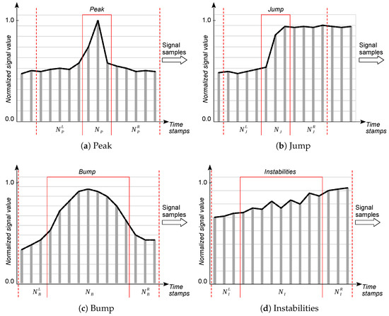 By understanding the physical basis of individual types of anomalies, it is possible to search for methods (both heuristic and neural) for their detection, thus answering whether a given fragment of signal samples contains a sequence of samples that can be classified into one of the types identified in Table 1. Subsequently, we can look for methods for their segmentation, which allow for determination of their most probable positions in the analyzed sequence. Of course, a straightforward solution would be to use an autoencoder that is trained to process the input signal into the same output signal, where the objective function is to minimize the output signal reconstruction error. When processing an unknown signal in this way, an excessive reconstruction error would indicate an anomaly that is either known (explainable) or unknown beforehand. However, a disadvantage of this approach when dealing with a small volume of training data is that a valid signal that was not in the training set may also be considered an anomaly. A false positive error, i.e., detecting an anomaly where there is none, may result in the removal of an important fragment of the signal during its cleaning. Therefore, a more reasonable approach in our case was to study the similarity of a signal fragment to previously established patterns. In this line, we parameterized four types of pattern explained in Table 1; namely, peaks, jumps, bumps, and instabilities [15]. These patterns are outlined schematically in Figure 1.