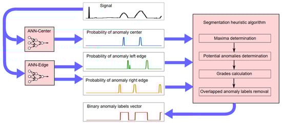 In the second stage of NPH, the neural network models are used to detect anomalies in the signal by feeding a signal window of fixed length to the input of each model. The anomaly center and left edge probabilities are obtained directly from the ANN-Center and ANN-Edge models, while the right edge is obtained by inverting the input vector to the ANN-Edge model. The overall NPH anomaly segmentation process is described in Algorithm 1.