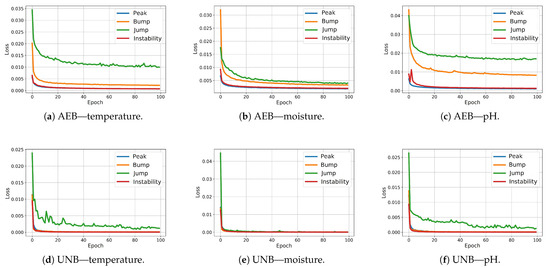 As a reference for assessing the effectiveness of time-series cleaning using detectors exploiting the neural network models NPH, AEB, and UNB, we used a heuristic method with simulated annealing-optimized (SA) detector parameters for each anomaly class specified in Figure 1. At least two time series were used for each signal (M, T, and pH): one with truly labeled anomalous samples, and another with samples labeled by the detector being optimized. Several independent optimization tasks were created in this way and were executed in parallel in the computing cloud, each targeting a specific combination of anomaly signal types. As a result, the best possible values of the parameters for individual anomalies were determined, such that each detected anomaly corresponded as closely as possible to the true anomalies [15].