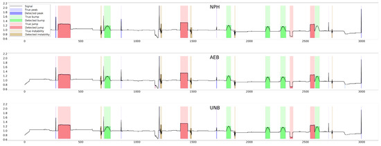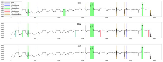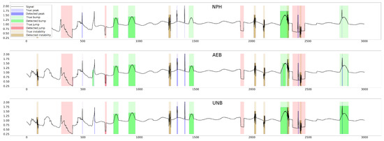 The graph shows a relatively small improvement in signal quality with NPH over SA, whereas the improvements of AEB and UNB over SA are more significant. However, in the case of detection alone (without taking into account the effects of the cleaning algorithm), the NPH method was clearly better than the SA method, yielding almost twice the IOU value, evidence of which may be found in [14]. It also performed better than the AEB method in some cases (e.g., in segmenting bump anomalies in the moisture signal, as can be seen from Table 5 and Table 6).