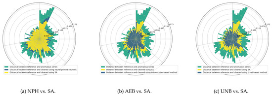 We evaluated the effectiveness of each of the previously analyzed anomaly detection methods defined in Figure 1 in the same way as in [15], that is, by measuring the average distances between each reference signal (ground truth) and the signals cleaned via the operations specified above. The polar charts shown in Figure 18 present the results we obtained for all seven (s01–s03, s10, s21–s23) devices, with distances averaged across 10 cleaned signals for every week of the lifetime of each sensor.