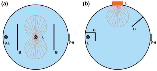 The schemes of integrating spheres with different internal geometries: (a) “4π”and (b) “2π”; L—tested sample or standard lamp, AL—auxiliary lamp, B—baffle, PH—location of the photometric head.