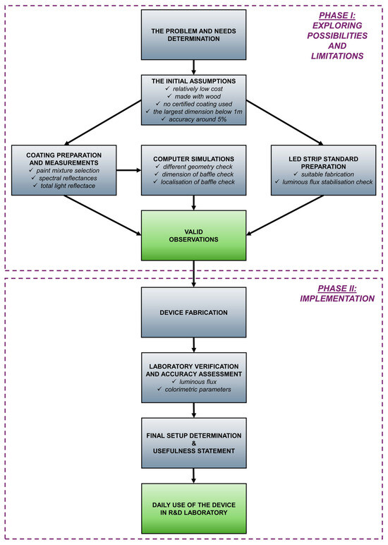 The conducted research process was comprehensive. The individual stages of this process are shown in Figure 3. It can generally be divided into searching for possibilities and limitations and implementing the designed device. The problem and need were initially defined: “searching for an alternative, cheap method for measuring the luminous flux of LED strips.” Then, preliminary assumptions were made: