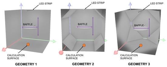 By knowing the values of the reflectances, the process of simulating the internal geometry of the designed device was initiated. For this purpose, the DIALux software was employed to design interior lighting. Appropriate models were prepared for three different geometries. Geometry 1 was characterized by only a baffle in the center of the device. Geometry 2 had additionally beveled extended vertical edges of the cube. Geometry 3 had additional beveled corners of the cube. Geometries 2 and 3 resulted from the anticipated need to provide a more uniform illumination of the device’s internal walls. All internal geometries are schematically presented in Figure 5.