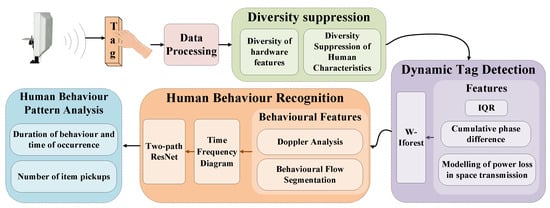 - We develop a behavior recognition model to segment behavior streams and use Doppler frequency analysis to identify specific behavior characteristics and changes. We also construct a time-frequency map based on wavelet transform to illustrate energy changes in behavior and propose a dual-path residual network to recognize behaviors such as taking away, putting back, picking up, and putting back.