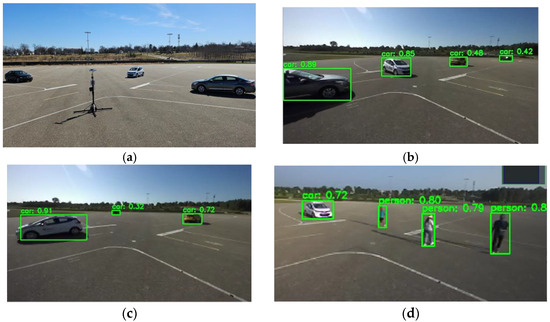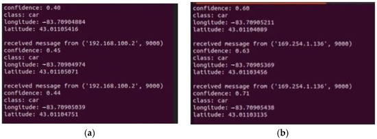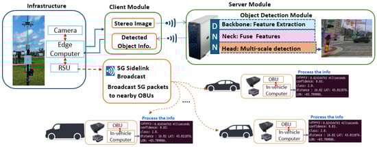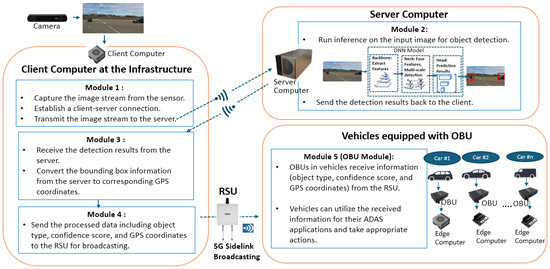 Socket programming establishes client–server communication, where a socket serves as an endpoint for sending or receiving data over a network. Socket programming enables data exchange between clients and servers through network connections. The client–server communication process involves capturing real-time video streams using an edge computing device attached to an RSU sending this livestream data to a server computer. The server computer conducts object detection using the DNN model, such as YOLOv5 [38]. The server identifies and locates objects in the livestream, generating bounding boxes around detected objects and classification labels (e.g., vehicle and pedestrian). After object detection and processing, the server returns the detection information to the client, which then displays the results, as shown in Figure 5.