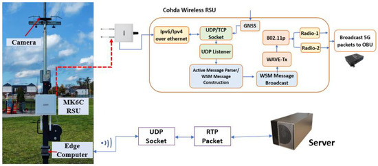 For the RSU device at infrastructure, the Cohda Mk6C RSU [32] was selected due to its 20 MHz bandwidth and compatibility with the 5.9 GHz ITS spectrum. Traffic information is sent from the edge computing unit to the RSU using the User Datagram Protocol (UDP), which is known for its low-latency communication. The Cohda Mk6C RSU’s communication framework, as shown in Figure 2, is specially designed for reliable communication in dynamic environments. This setup allows the RSU to broadcast WAVE short messages, which are crucial for V2X communication [33].