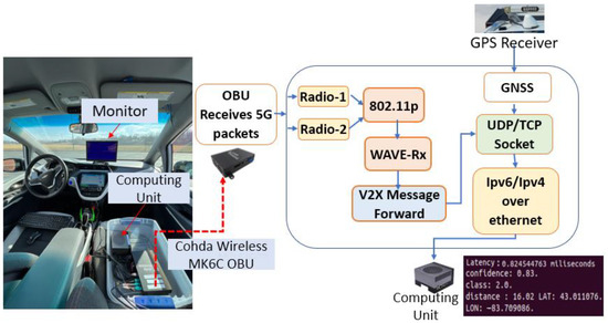 The OBUs can be used for smooth communication with the RSU or nearby OBUs. The OBUs are easily integrated into vehicles, as shown in Figure 3. The GPS receiver is placed on the roof of the testing vehicle. The GPS module used in this system should be placed under open-sky conditions, with the GPS signal assumed to be consistently available and unaffected by significant obstructions such as tall buildings or dense foliage. Using the Cohda Wireless MK6C EVK as the OBU [34], it provides a 20 MHz bandwidth and works within the 5.9 GHz ITS spectrum. When the OBU receives WAVE short messages, it decodes them and sends the data to the vehicle’s computing unit through an Ethernet connection with the UDP. The edge computing device processes the received information to support the vehicle’s autonomous or driver-assistance systems [33].