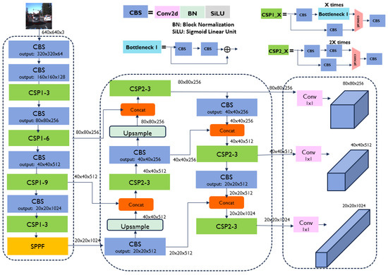YOLOv5 consists of the following three parts: backbone, neck, and head, as shown in Figure 4. YOLOv5 [38] uses CSPDarknet53 as a feature extraction backbone, which is inspired by CSPNet (Cross Stage Partial Network) that enhances feature learning while reducing computational cost. In the neck of YOLOv5, a combination of Path Aggregation Network (PANet) and Feature Pyramid Network (FPN) fuses information for better feature extraction [40]. PANet creates a bottom-up path to pass low-level features back into deeper layers, improving localization and small object detection. FPN is represented by the upsample and concat operations in the neck. It merges high-level semantic features from deeper layers with low-level spatial features from shallower layers, enhancing multi-scale feature detection. In YOLOv5’s head, the detection results are generated in detected objects’ bounding boxes, object detection scores, and class probabilities, similar to previous YOLO versions [40] but with improved anchor box predictions and post-processing.