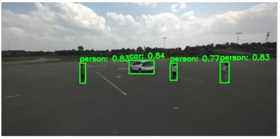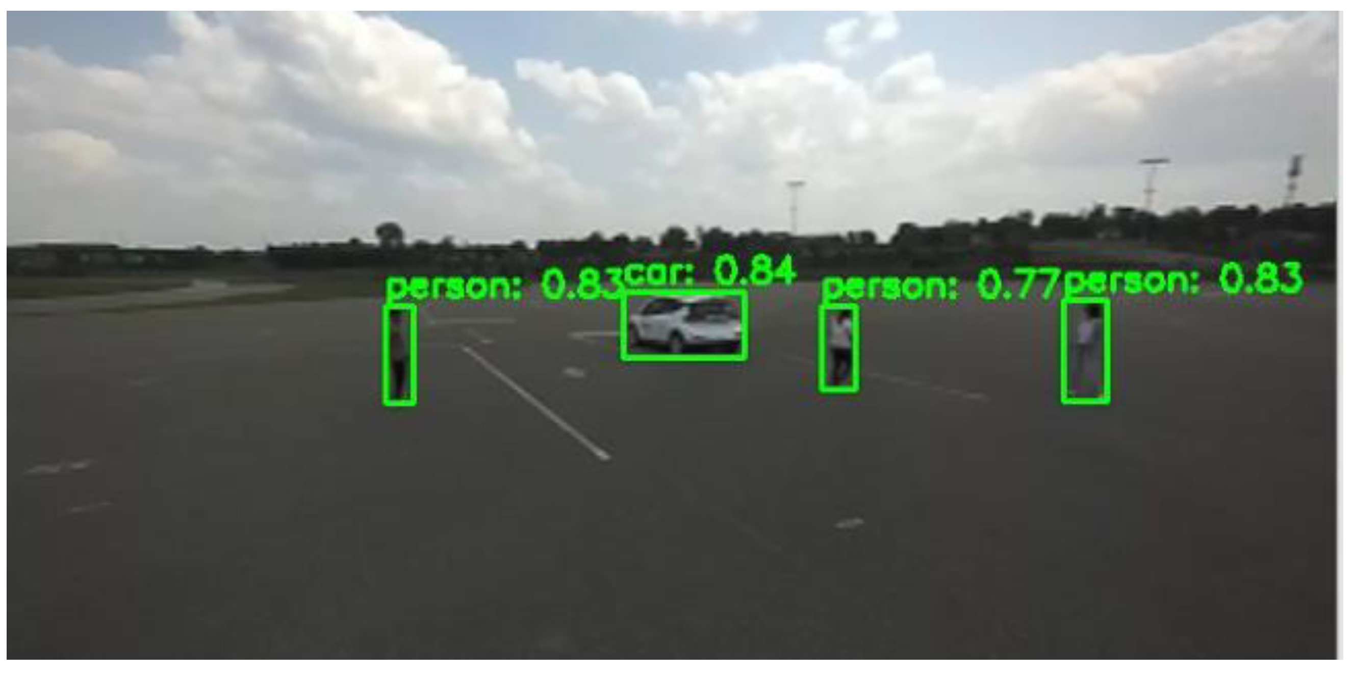 Figure 5 presents the detection results by the YOLOv5 model. The system is designed to detect two types of target objects: pedestrians and cars. The demo image displays the detected object classes and their confidence scores, where the target objects are correctly classified with high confidence.