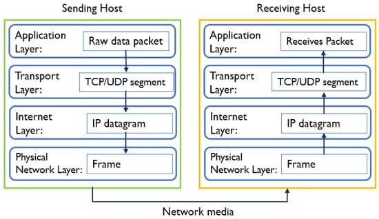 Figure 6 presents the steps involved in the TCP/IP model. The application layer in the client generates raw data, which is passed to the transport layer and encapsulated into a TCP or UDP segment, depending on the protocol. This layer adds a header with details such as source port, destination port, and sequence number. The segment then moves to the Internet layer, where the IP protocol adds its header containing the source and destination IP addresses. Then, the IP packet is passed to the network access layer for physical transmission using Wi-Fi or Ethernet protocols [42]. On the receiving host, the process occurs in reverse order.