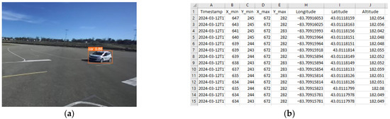Mapping map generation: (a) the bounding box of the test vehicle equipped with the OBU. (b) The bounding box information of the detected test vehicle and the corresponding GPS coordinates from the OBU are recorded.