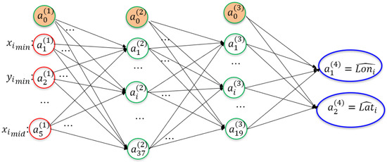 The selected NN architecture contains four layers: one input layer with five input features, two hidden layers, and one output layer with two output nodes. The hidden layer 1 contains 37 nodes, while the hidden layer 2 contains 19. The notation indicates the ith node in the jth layer. The bias terms in layers were represented using the subscript 0. Among 9031 data samples, 85% of the data is used for training a backpropagation NN and the remaining 15% for validation. The NN model’s performance is measured using the Haversine formula [46]. The Haversine formula in Equations (7) and (8) calculates the distance of two GPS points on the Earth, ( and (, where R is the Earth’s radius (mean radius = 6,371,000 m).