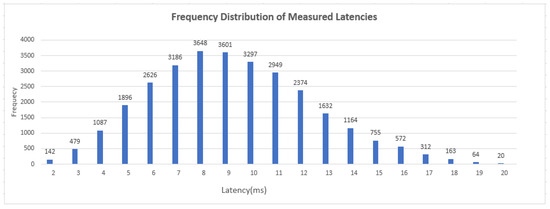 A total of 29,967 transmission events were evaluated, as shown in Figure 10. In Figure 10, a histogram with nineteen bins is presented, with each bin labeled on the x-axis by its center value. The histogram illustrates the frequency distribution of the measured latencies. The average latency was 9.24 ms, with a minimum latency of 2 ms and a maximum of 20 ms.
