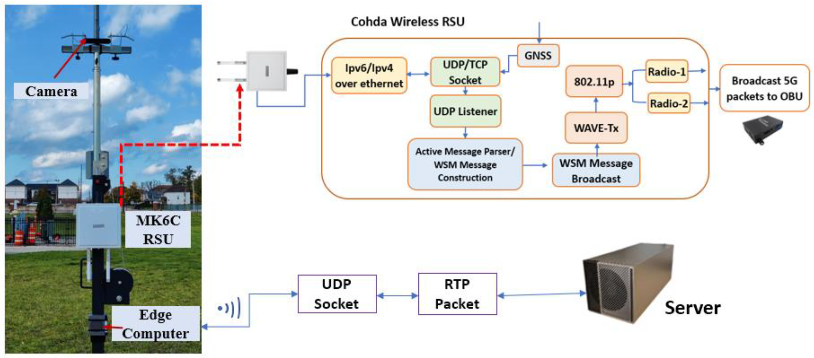 32] was selected due to its 20 MHz bandwidth and compatibility with the 5.9 GHz ITS spectrum. Traffic information is sent from the edge computing unit to the RSU using the User Datagram Protocol (UDP), which is known for its low-latency communication. The Cohda Mk6C RSU’s communication framework, as shown in